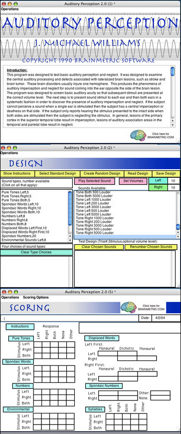 This program provides the tools to examine auditory perception, auditory neglect and cerebral dominance for auditory information, such as the well-known left hemisphere dominance for language sounds. The program allows the user to perform the standard audiological neglect studies, test auditory acuity for amplitude and pitch using pure tones, perform dichotic listening studies with pure tones and speech, and examine auditory agnosia using environmental sounds. Stimuli include pure tones, displaced numbers, displaced spondaic words and environmental sounds. You have complete control over which type and how many stimuli are presented. You can design your own set or use a standard set that represents a sampling of all the types and formats.