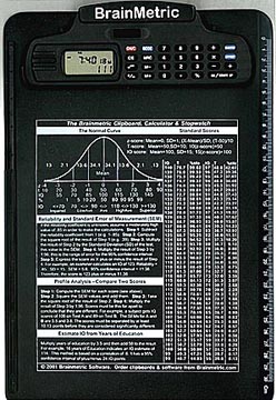 SORRY. THE CLIPBOARDS ARE CURRENTLY SOLD OUT. If you already have one and need another set of instructions or links to batteries, check the links below. The Brainmetric Super Clipboard We finally found a clipboard that includes a stopwatch and a calculator. Similar clipboards only have a calculator. At long last, all your testing tools are in one unit. We then improved the clipboard with an imprint that includes these features: