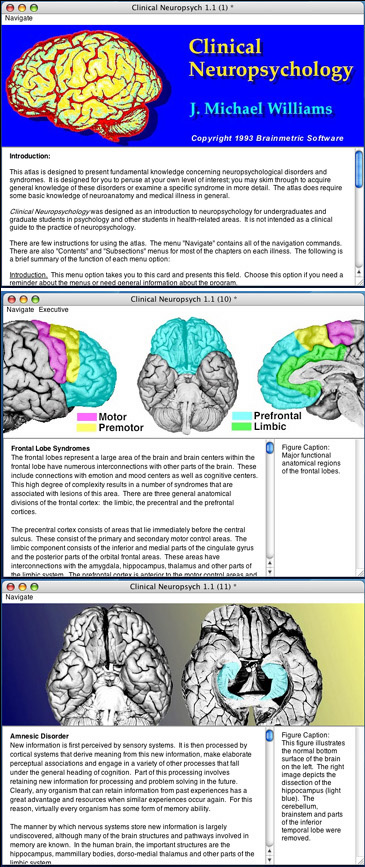 Clinical Neuropsychology is a concise summary of neuropsychological syndromes. These syndromes are behavioral manifestations of lesions to functional brain systems. These syndromes include aphasia, agnosia, amnesic disorders, apraxias and frontal lobe syndromes. Each is associated with characteristic symptoms, test findings and neuropathology. It is difficult to keep track of all of them because they are so varied, many have overlapping symptom clusters and some are so uncommon that their definition quickly fades from memory. This psogram provides a concise summary of each syndrome and high-quality color and grayscale images illustrating brain anatomy. The program includes an extensive glossary and index. Each summary includes a general description of the syndrome, an illustration of the brain systems involved and suggestions for neuropsychological assessment. Clinical Neuropsychology is an excellent reference work and supplement to courses in clinical neuropsychology, physiological psychology and neuroscience. Price: $69