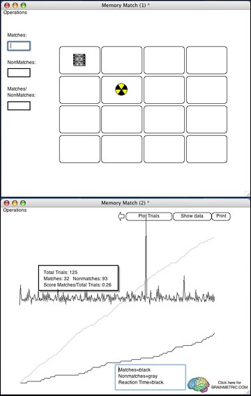 Memory Match Test and train memory abilities using a popular "Concentration" matching format for presenting information. The program allows you to choose levels of complexity, expose the stimuli for controlled periods, store multiple sessions for comparison over time, plot results for cumulative matches (hits) and nonmatches (false positives) as well as item response times. These plots display interesting response patterns that reveal levels and types of memory disorder. This is an excellent procedure for cognitive retraining of memory. Price: $39