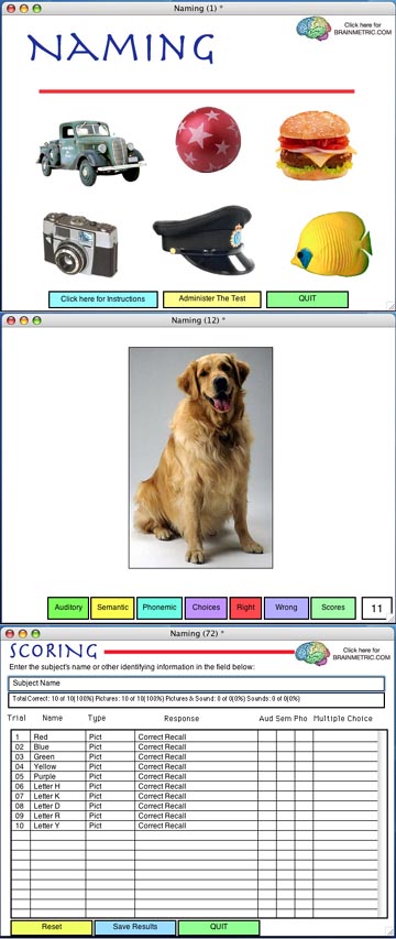 This test takes a novel approach to the conventional assessment of naming ability. It consists of 70 color photographic images illustrating objects or scenes that have common names. The test stimuli also include sounds that have common names. If the subject cannot immediately name the stimulus, then the test allows you to present cues in hierarchical fashion. For photographic images, this includes an associated sound stimulus, a semantic cue, a phonemic cue and multiple choices. For example, one trial first shows the photograph of a dog. If the subject cannot name the picture, then the examiner clicks on a button that plays the sound of the dog barking. The next cue level is semantic: the examiner clicks on a button that displays the phrase, This is a type of animal. The phonemic cue consists of the beginning sound element of the name: do. This is played as a standard digitized speech sound. In contrast to paper-and-pencil tests of this type, the examiner does not recite the phonemic cue. Finally, if the subject still cannot name the picture, the subject is shown a list of multiple choices and asked to choose the name. The computer presents stimuli and records the presentation of cues and correct and incorrect responses. The test is useful in examining the naming abilities of aphasic patients.
