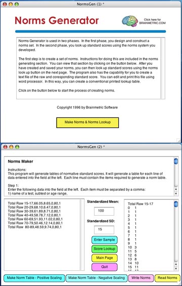 A vast body of testing normative data lies unused because the data were published in the form of means and standard deviations and not as normative tables. You might also have your own normative data sitting around unused because the burden of creating normative tables prohibits converting the data into usable, tabular form. Norms Generator is the answer. It converts raw score means and standard deviations from a normative sample into a set of normative tables. It allows any grouping of the normative sample, such as age or education stratification. You can also specify any standard score metric, such as the familiar mean of 100 and standard deviation of 15, used by most intelligence tests. After you specify the type of tables you want, the program crunches the numbers and generates a text file that you can use with any word processor.