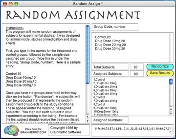 Random Assignment Researchers are often faced with the task of randomly assigning subjects to experimental conditions. This program makes random assignments of numbered subjects to experimental groups coded by the investigator. You enter the group code identification and sample sizes. Random Assignment then randomly assigns subjects to each condition. This program was originally designed for drug trial research. Price: $39