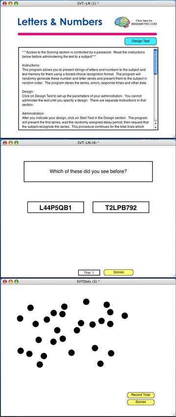 Symptom Validity Scales A variety of techniques have recently been developed to examine malingering and factitious responding. All involve presenting stimuli to the subject which appear complex but actually incorporate very simple cognitive processes, such as simple memory recognition. If the subject responds worse than chance on such a task, it is taken as evidence of intentional factitious responding. This program allows the user to easily present what appear to be complex stimuli in both recall and recognition memory formats. The program records errors and item response times; quick responses at chance error levels indicates a pure guessing strategy. The second screen image on the right depicts the forced-choice recognition memory task. Here the subject is shown a single string of letters and numbers. Following a short delay, the subject is shown a pair of strings and asked to indicate which string was presented before.The program computes probabilities of responding worse than chance. Price: $99